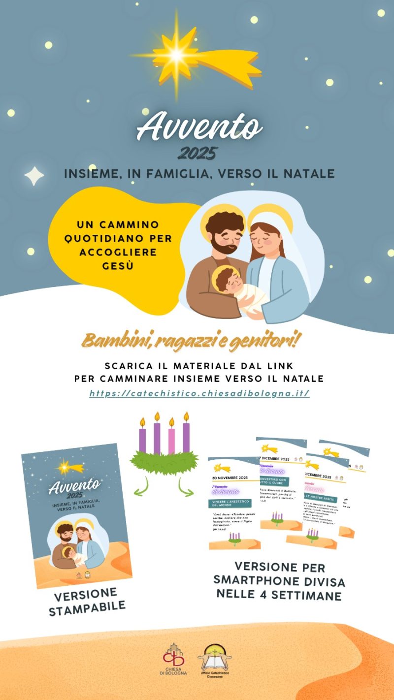 Invitiamo i bambini e i ragazzi dei percorsi di catechesi a un cammino quotidiano di preghiera insieme con i loro genitori, sui passi dell’Avvento e del Natale, per accogliere il Signore Gesù. Il Cardinale Arcivescovo Matteo Zuppi, ci scrive queste parole: Carissimi, che gioia aspettare qualcuno! A Natale viene l’ospite più grande di tutti: Dio che si nasce, che si fa uomo per farci capire … Continue reading Avvento 2025 – Insieme, in famiglia, verso il Natale